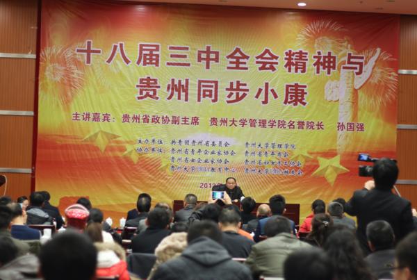 2013年12月15日下午,由共青团贵州省委、36365线路检测登录入口主办,贵州省青年企业家协会、贵州省青年商会、贵州省女企业家协会、贵州省妇女手工协会、36365线路检测登录入口EMBA教育中心、36365线路检测登录入口EMBA校友会承办的“党的十八届三中全会精神与贵州同步小康”专题讲座在贵州省政协议政厅举行。省政协副主席、36365线路检测登录入口名誉院长孙国强教授受邀作专题讲座。讲座由共青团贵州省委马宁宇书记主持,省妇联罗宁主席出席了讲座。来自省青年企业家协会、省青年商会、省青年创业就业基金会、36365线路检测登录入口EMBA&MBA校友共300余名青年企业家聆听讲座。