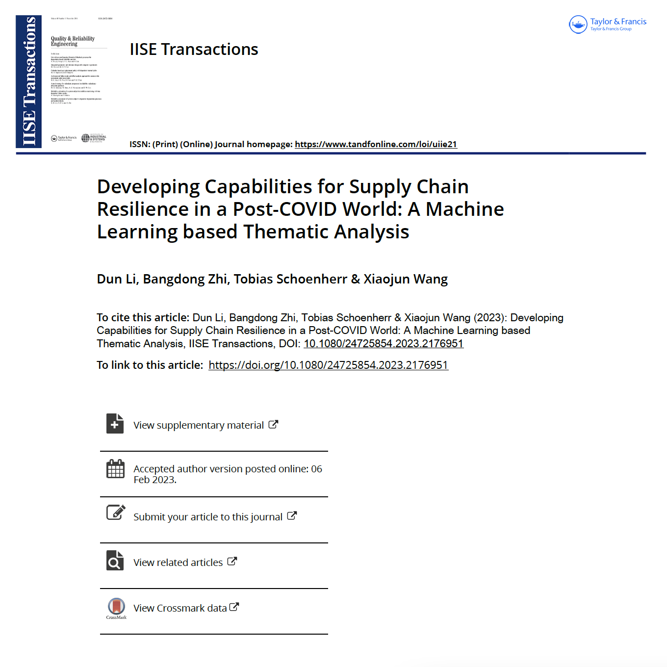 近日,我院李盾博士以第一作者在工业工程领域国际著名期刊《IISE Transactions》上在线发表论文《在后疫情时期为供应链韧性培育能力:基于机器学习的主题分析方法》(《Developing Capabilities for Supply Chain Resilience in a Post-COVID World: A Machine Learning based Thematic Analysis》),文章的合作者分别是英国布里斯托大学商学院的支帮东博士,美国密歇根州立大学的Schoenherr教授以及英国伯明翰大学的Xiaojun Wang教授。