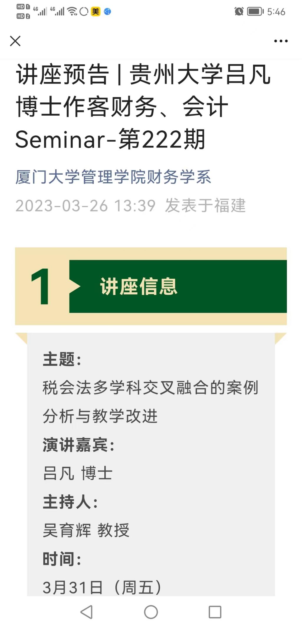 3月31日36365线路检测登录入口会计系主任吕凡老师应邀前往厦门大学36365线路检测登录入口,开展了“税会法多学科交叉融合的案例分析与教学改进”的专题讲座。