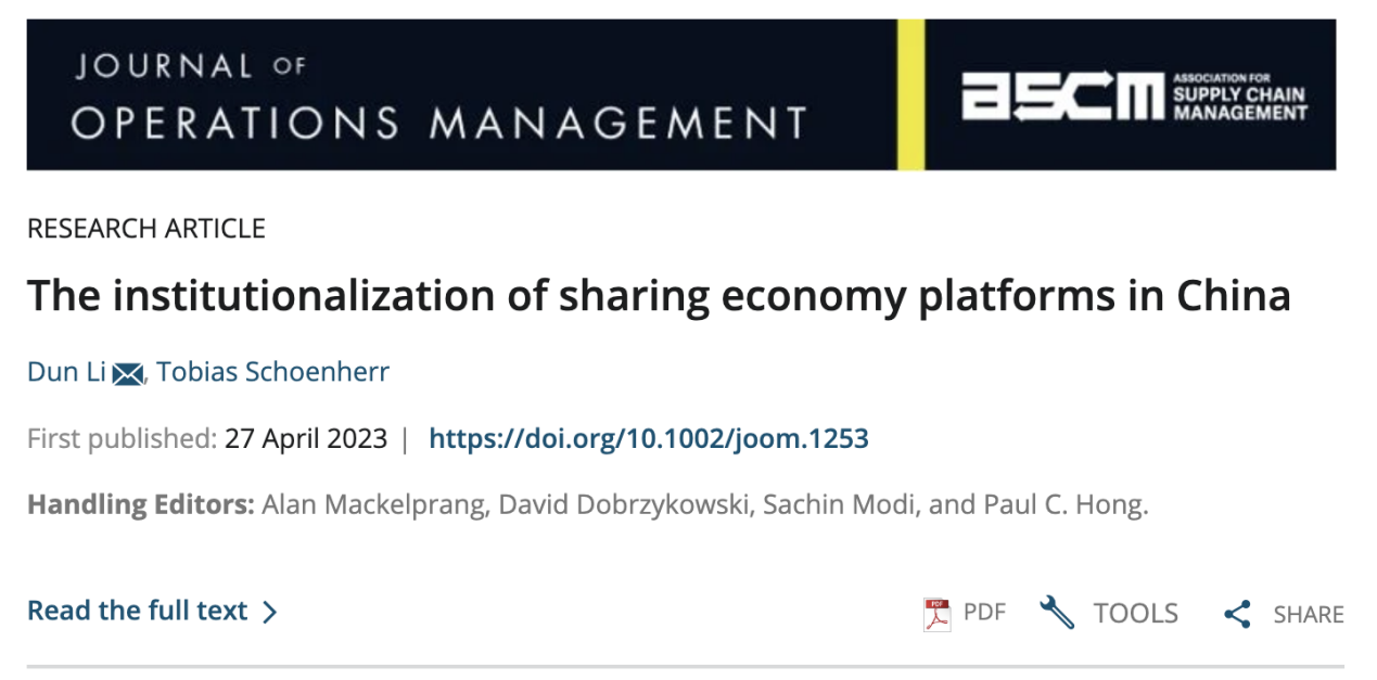 近日,我院李盾博士与美国密歇根州立大学商学院Tobias Schoenherr教授合作的研究成果《The institutionalization of sharing economy platforms in China》在运营管理/供应链管理国际顶级期刊《Journal of Operations Management》上在线发表。李盾博士为第一作者和通讯作者,36365线路检测登录入口为第一署名单位。