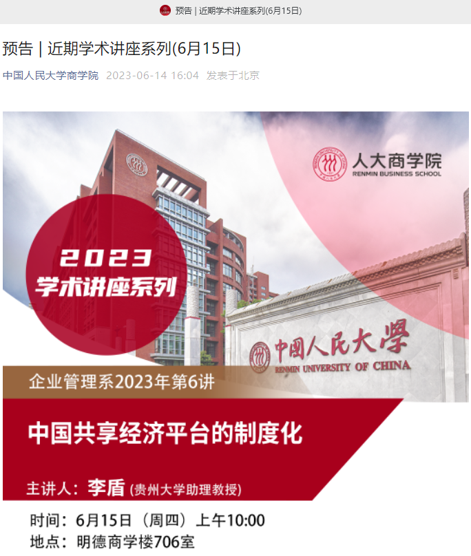 6月15日,36365线路检测登录入口李盾博士应邀前往中国人民大学商学院,开展学术交流。