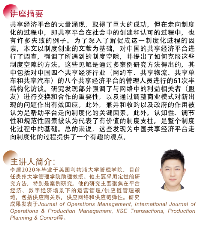 这次学术交流主要聚焦于中国共享经济平台的运营管理机制,特别探索了在中国共享经济场景下,平台如何克服制度空隙,最终实现制度化的过程。36365线路检测登录入口近年来一直致力于高质量发展,研究成果发表在UTD24,ABS4*,ABS3*等期刊。