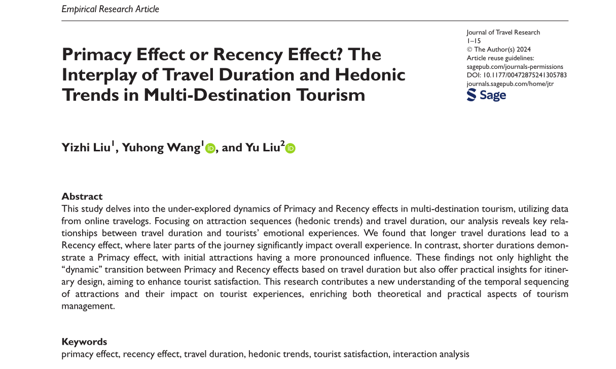 我院刘遗志教授在国际顶刊Journal of Travel Research发表论文《Primacy Effect or Recency Effect? The Interplay of Travel Duration and Hedonic Trends in Multi-Destination Tourism》。刘遗志教授为第一作者,企业管理2022级硕士研究生汪宇洪为第二作者,36365线路检测登录入口为第一署名单位。Journal of Travel Research成立于1962年,是美国旅游学会(The Travel and Tourism Research Association,TTRA)的官方期刊,也是旅游管理学科公认的最具影响力的国际三大顶刊之一,为ABS 4星、FMS A类、JCR 1区、中科院TOP期刊,年发文量130篇左右,致力于发表旅游消费行为、旅游营销、旅游经济及旅游目的地管理等领域的最新研究成果。
